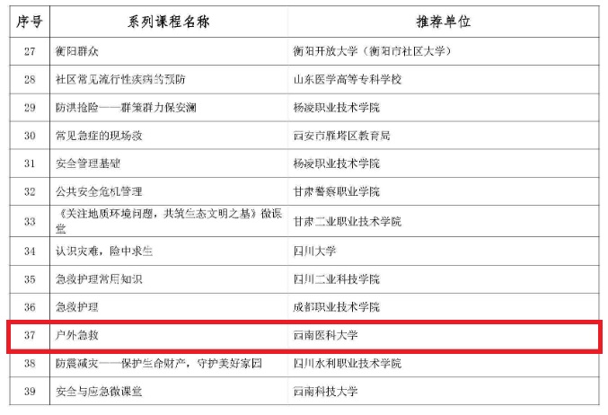 kaiyun官网基础医学院孙国刚教授带领的国家级一流课程(急救整合与创新科普)团队按照通知要求,认真组织了本次特色课程和经典案例的申报,并以户外急救为主题,拍摄录制了20多个以户外急救相关的微课,还对每个微课进行详细的注解和说明。经校内专家评审、学校和四川省教育厅推荐,最终由汤华军副教授作为课程负责人申报的 《户外急救》 获得教育部首批社区教育“能者为师”特色课程。