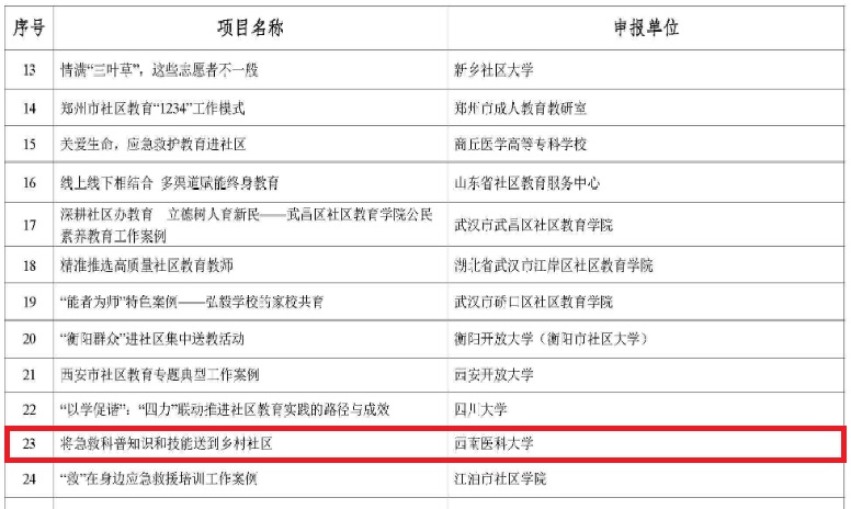 国家级一流课程团队还不断加强对多年来的科普活动进行总结,凝炼出《将急救科普知识和技能送到乡村社区》案例。在相关部门推荐基础上,经技术审查、内容审核和专家综合评议、教育部指定网站公示等环节,该案例获得了教育部首批社区教育“能者为师”典型案例。