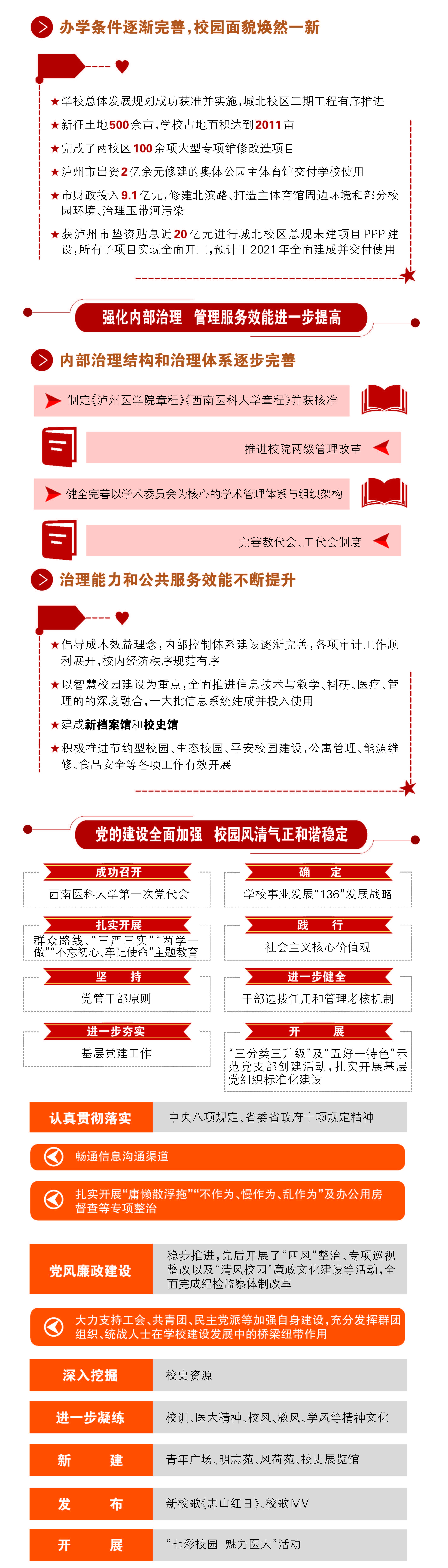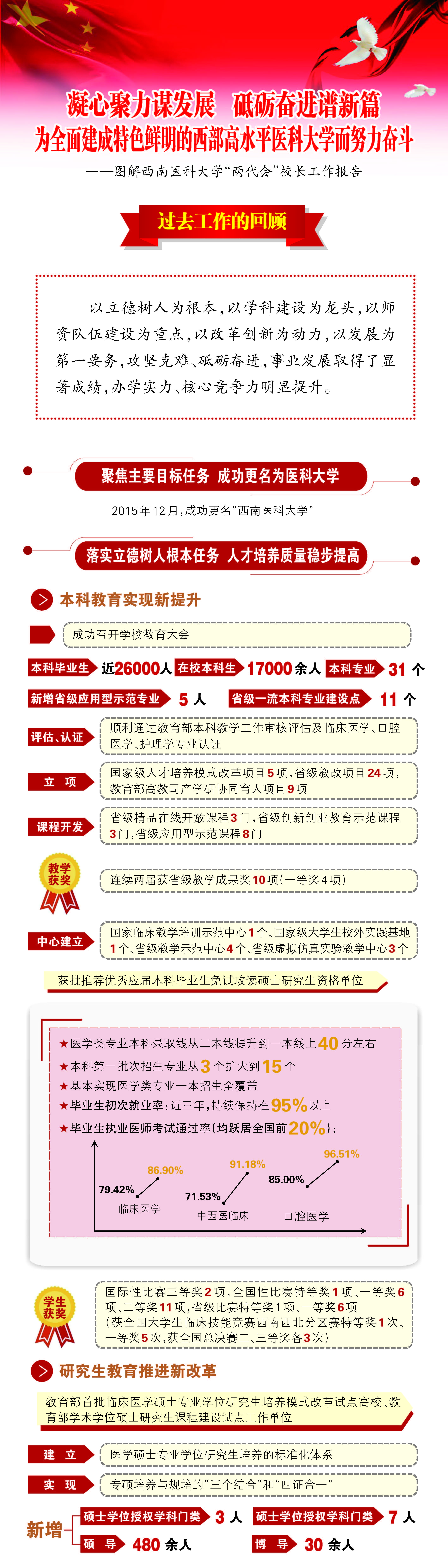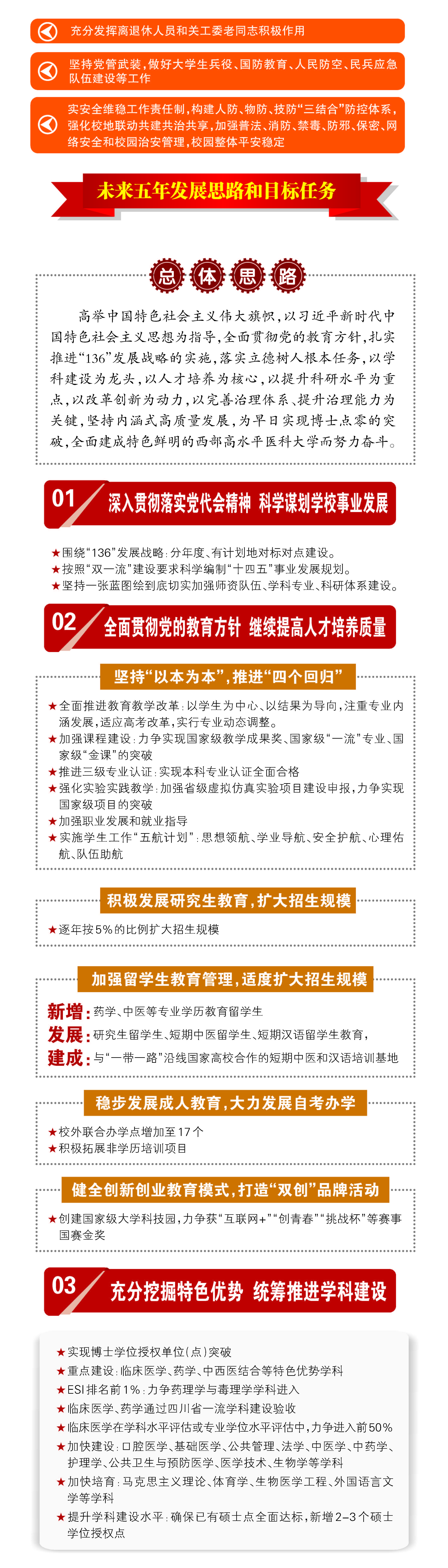 报告对过去工作进行了回顾,2012年以来,学校聚焦主要目标任务,成功更名为医科大学;落实立德树人根本任务,人才培养质量稳步提高;发挥学科龙头作用,科学研究水平再上台阶;实施人才强校战略,师资队伍建设成效显著;坚持开放办学理念,国(境)外交流合作更趋活跃;勇担使命与责任,服务经济社会成绩瞩目;切实关注民生,师生员工幸福指数不断提升;强化内部治理,管理服务效能进一步提高;党的建设全面加强,校园风清气正和谐稳定。接着,分析了发展面临的机遇和挑战。