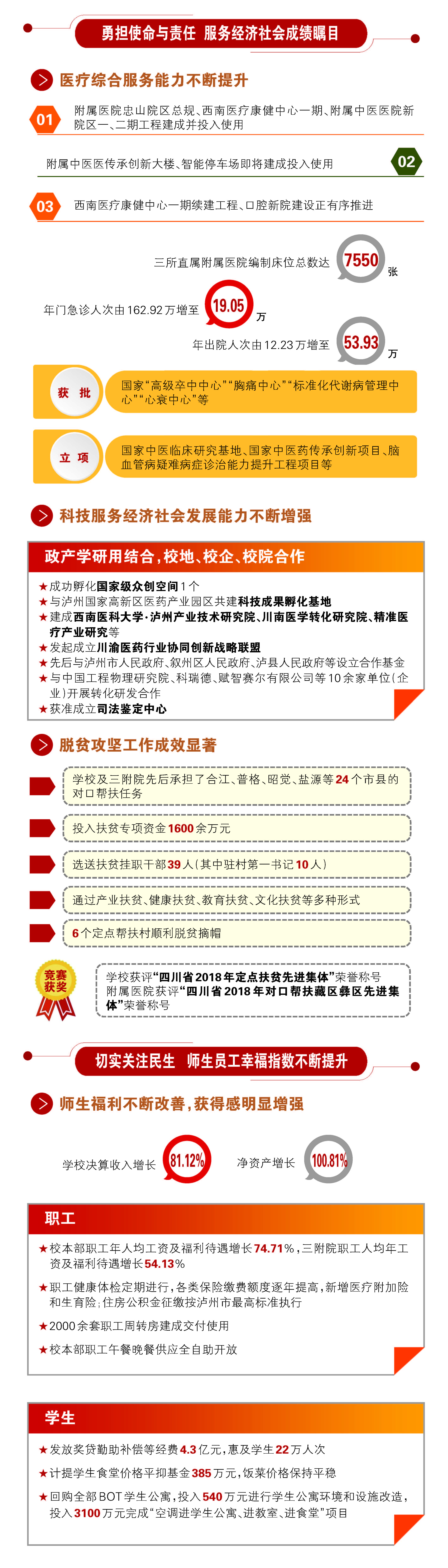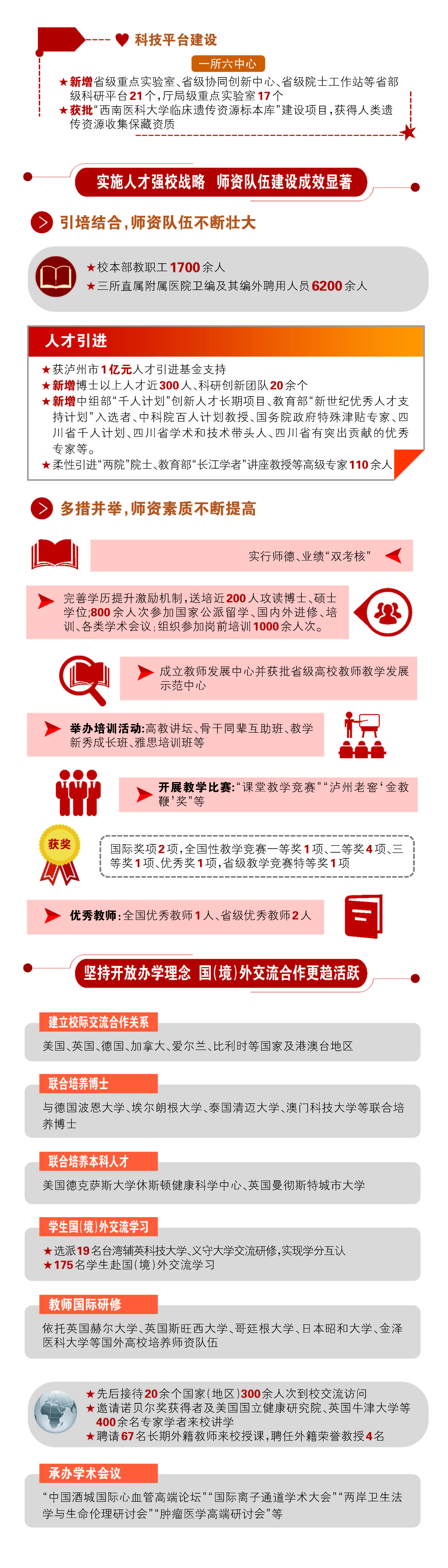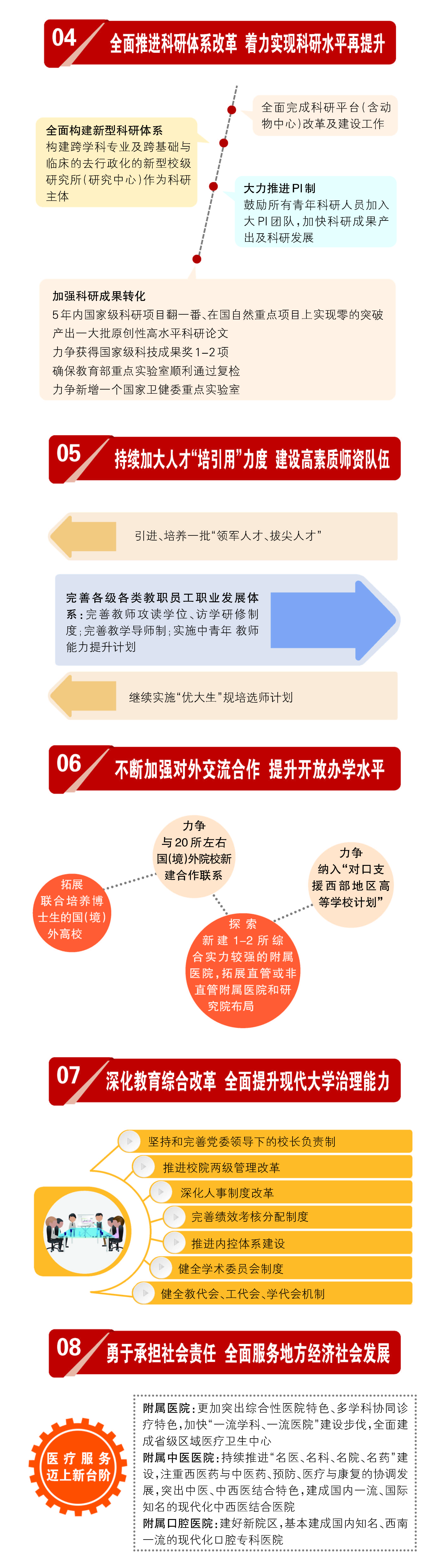 报告对过去工作进行了回顾,2012年以来,学校聚焦主要目标任务,成功更名为医科大学;落实立德树人根本任务,人才培养质量稳步提高;发挥学科龙头作用,科学研究水平再上台阶;实施人才强校战略,师资队伍建设成效显著;坚持开放办学理念,国(境)外交流合作更趋活跃;勇担使命与责任,服务经济社会成绩瞩目;切实关注民生,师生员工幸福指数不断提升;强化内部治理,管理服务效能进一步提高;党的建设全面加强,校园风清气正和谐稳定。接着,分析了发展面临的机遇和挑战。