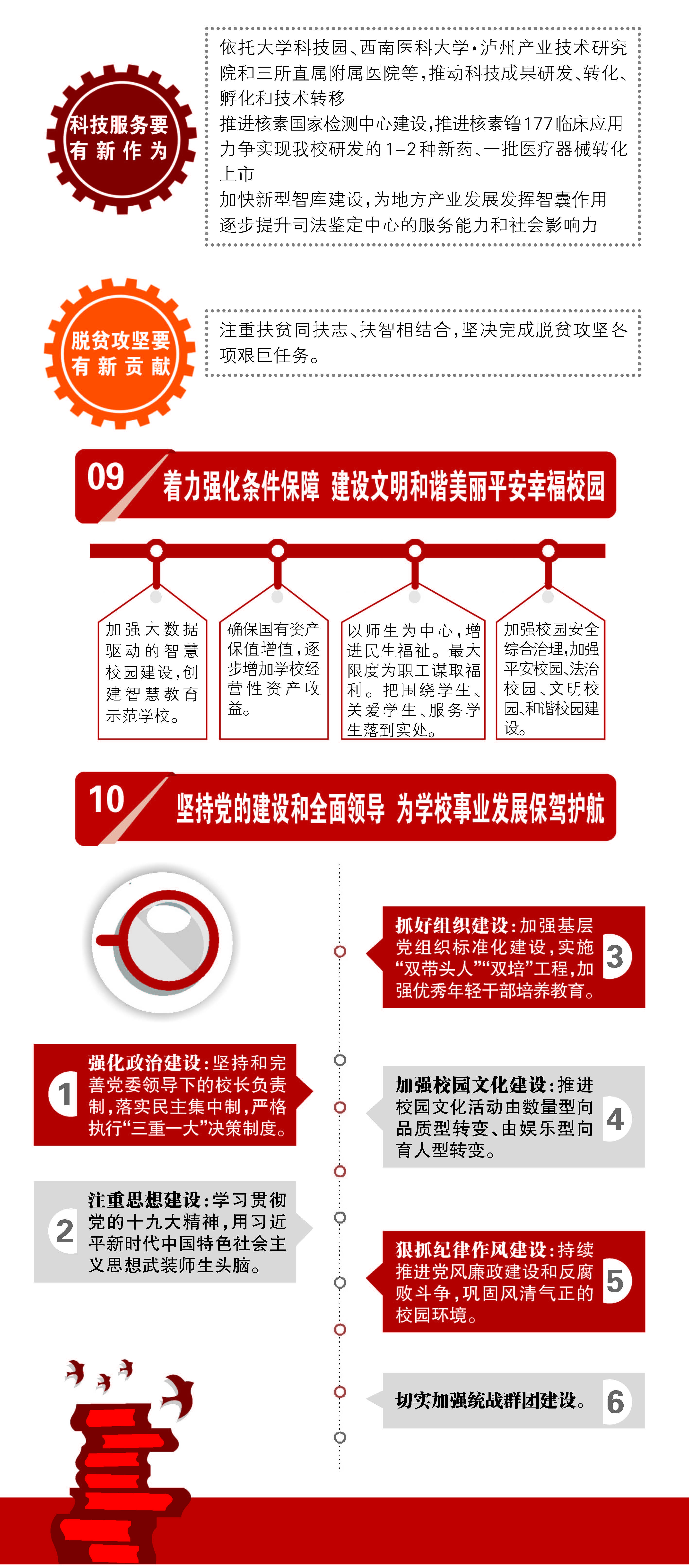 未来五年学校将深入贯彻落实党代会精神,科学谋划学校事业发展;全面贯彻党的教育方针,继续提高人才培养质量;充分挖掘特色优势,统筹推进学科建设;全面推进科研体系改革,着力实现科研水平再提升;持续加大人才“培引用”力度,建设高素质师资队伍;不断加强对外交流合作,提升开放办学水平;深化教育综合改革,全面提升现代大学治理能力;勇于承担社会责任,全面服务地方经济社会发展;着力强化条件保障,建设文明和谐美丽平安幸福校园;坚持党的建设和全面领导,为学校事业发展保驾护航。