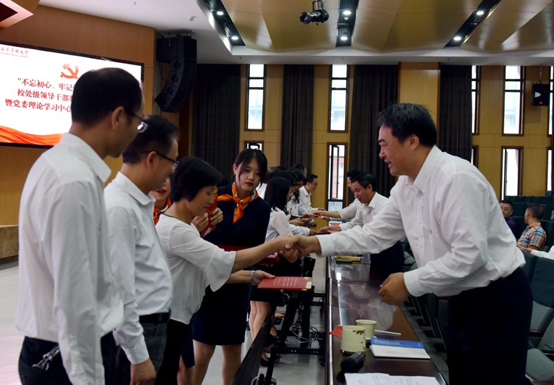 会议期间,举行了一场别开生面的主题党日活动。党委书记廖斌代表学校党委向全体党员发放了寄语卡,寄语全体党员干部“不忘初心、牢记使命”。会上还为9-10月入党的党员领导干部发放政治生日贺卡,相关代表分享了入党初心及践行感悟。