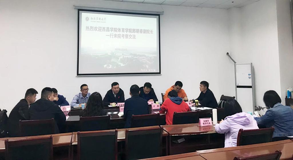 3月10日上午,西昌学院体育学院副院长郎朝春一行8人到体育学院就运动康复专业建设有关情况进行考察交流。体育学院院长王定宣、副院长王晓芳,党政办副主任王馨、运动康复系主任沙滟和教师代表等参加了座谈。