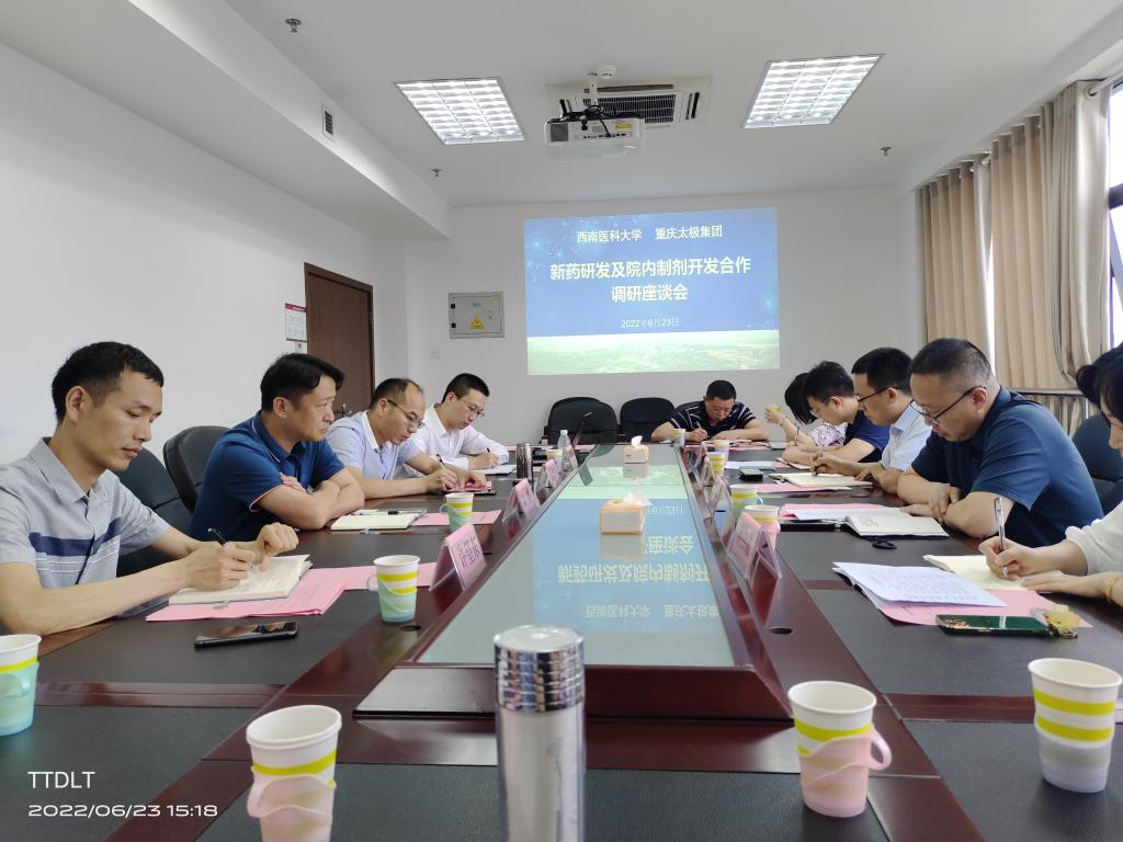 6月23日下午,重庆太极(集团)股份有限公司医药研究院副院长彭涛一行来校,就新药研发与院内制剂开发合作事宜在徳诚楼812会议室座谈交流。会议由科技处副处长许望东主持,对外联络处处长邓睿、附属医院副院长万居易、药学院副院长韦思平,科技处、附属医院、附属中医医院、药学院相关部门负责人及项目、团队负责人参会。
