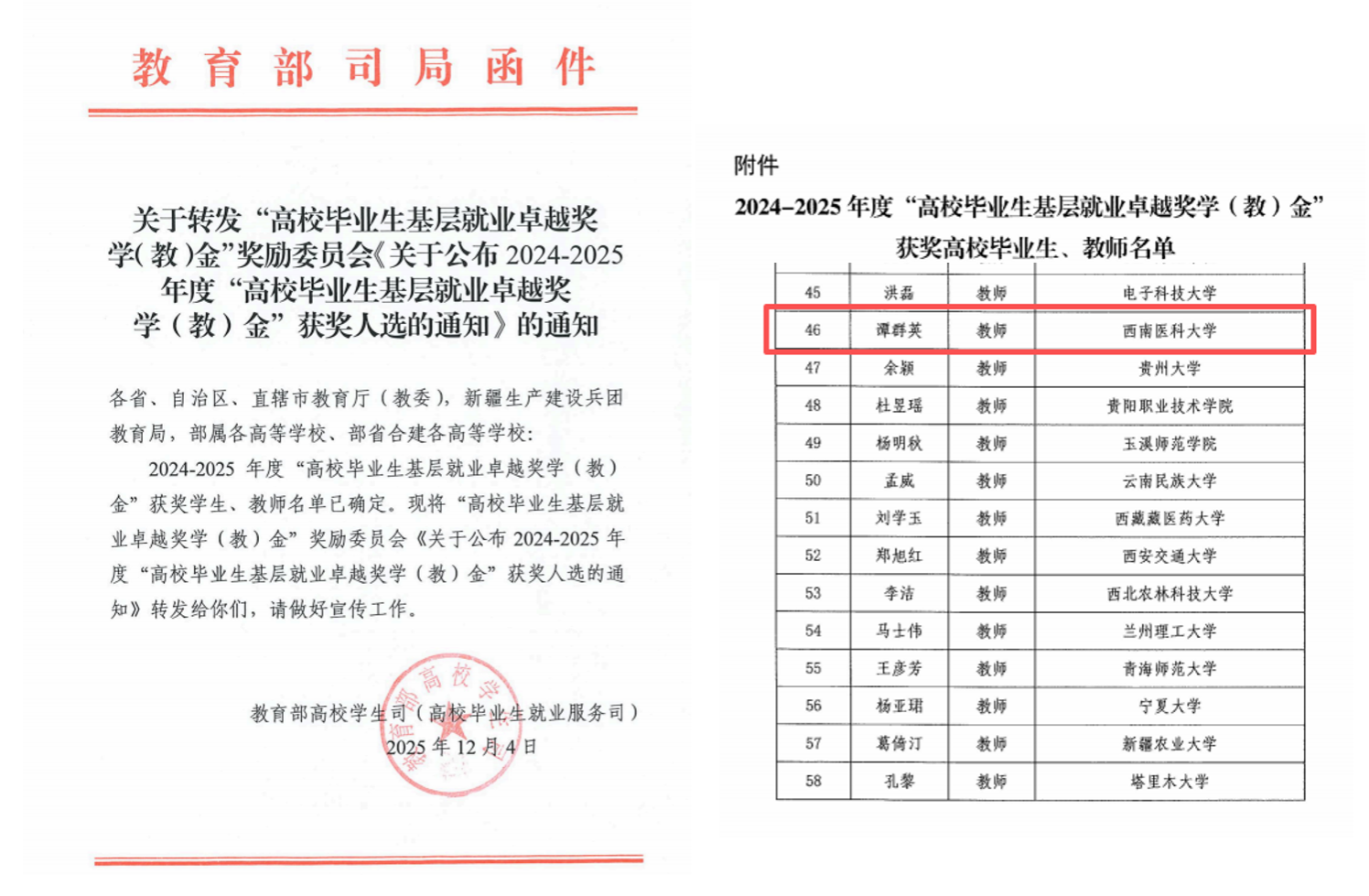 据悉,“高校毕业生基层就业卓越奖学(教)金”由教育部高校学生司(高校毕业生就业服务司)、教育部学生服务与素质发展中心指导,中国长江三峡集团出资,中国教育发展基金会设立,旨在表彰在基层就业创业中表现突出、取得显著成绩的普通高校毕业生,以及在指导学生赴基层就业工作中贡献突出的高校教师。本次评选经高校推荐、省级遴选、奖励委员会复核、公示等环节,最终确定获奖人员名单,全国共58名教师(四川省仅2名)获评此项荣誉。