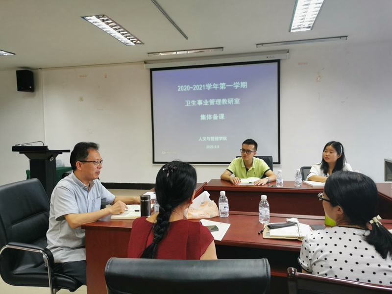 为提高新进教师的教学水平,保证教学质量,7月27日下午,卫生事业管理教研室在荟文楼207室开展了2020-2021-1学期集体备课活动。人文与管理学院院长赵成文教授全程出席,该教研室主任黄宵主持,教研室全体教师参与。