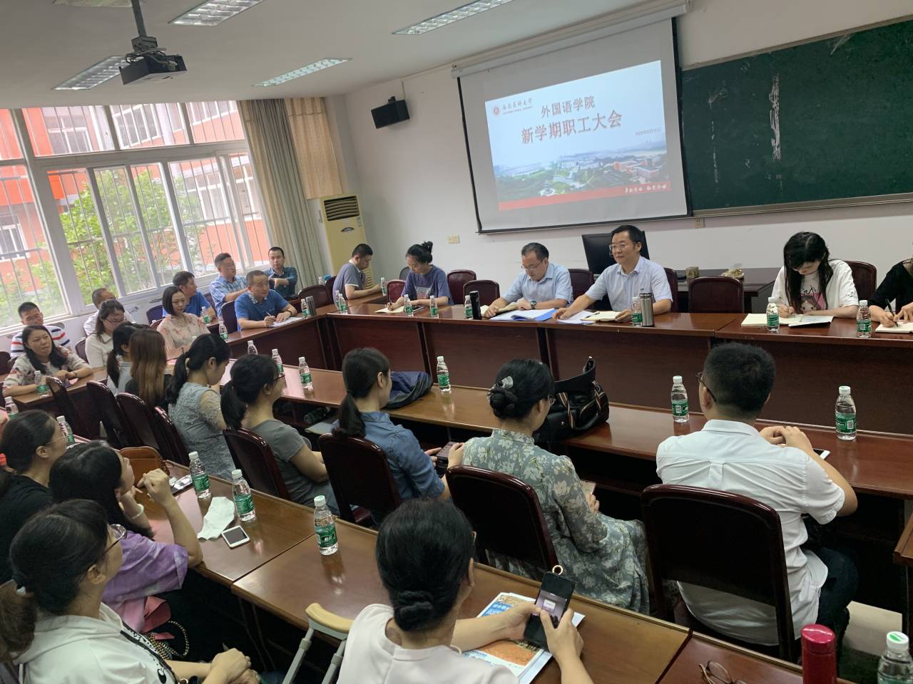 9月11日上午,外国语学院在荟文楼二楼会议室召开全院职工大会。会议由该学院党总支书记周晓昀主持,外国语学院院长田耘及学院全体教职工参加会议。