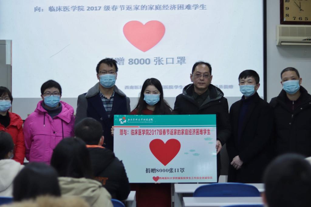 2021年寒假即将到来,为把资助育人工作落到实处,临床医学院辅导员为关心关爱学院困难学生疫情期间春节返家,学院全体辅导员献爱心自行组织购买了8000张医用口罩发放给家庭经理困难学生,1月29日上午,20名家庭困难学生代表参加了在忠山图书馆107教室举行的捐赠仪式,临床医学院党委副书记黎靖、全体辅导员及学生代表参加了此次活动,活动由临床医学院学生科科长王涛主持。