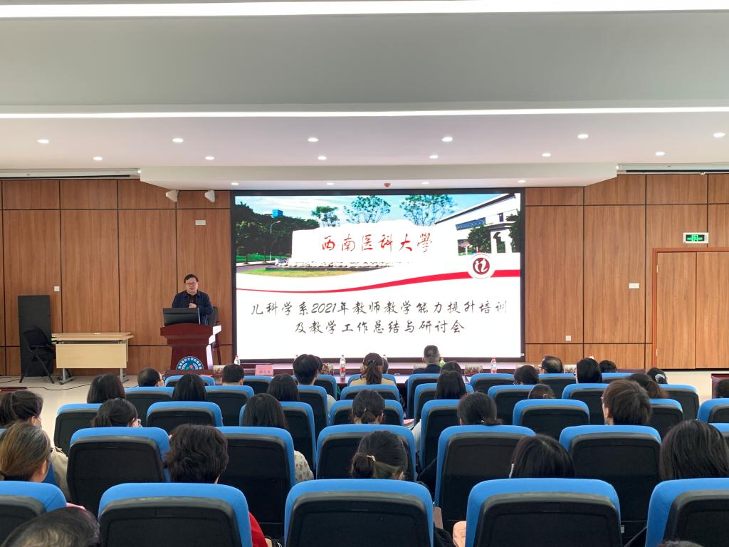 为深入落实立德树人根本任务,提升教学质量,强化教学设计和教学基本能力训练,4月20日下午,儿科学系在附属医院康健院区临床技能中心101教室,组织开展2021年教师教学能力提升培训活动及召开教学工作总结与研讨会,邀请教育评价与教师发展中心主任赵琼,学校专职督导员尹思源、龙汉安、邓存良,以及教务处实验与实践教学管理科科长郭志成参加。儿科学系处科级干部、各科室主任、教研室主任、教学秘书,任课教师和40岁以下的青年职工代表参加本次活动和会议,会议由系主任董文斌主持。