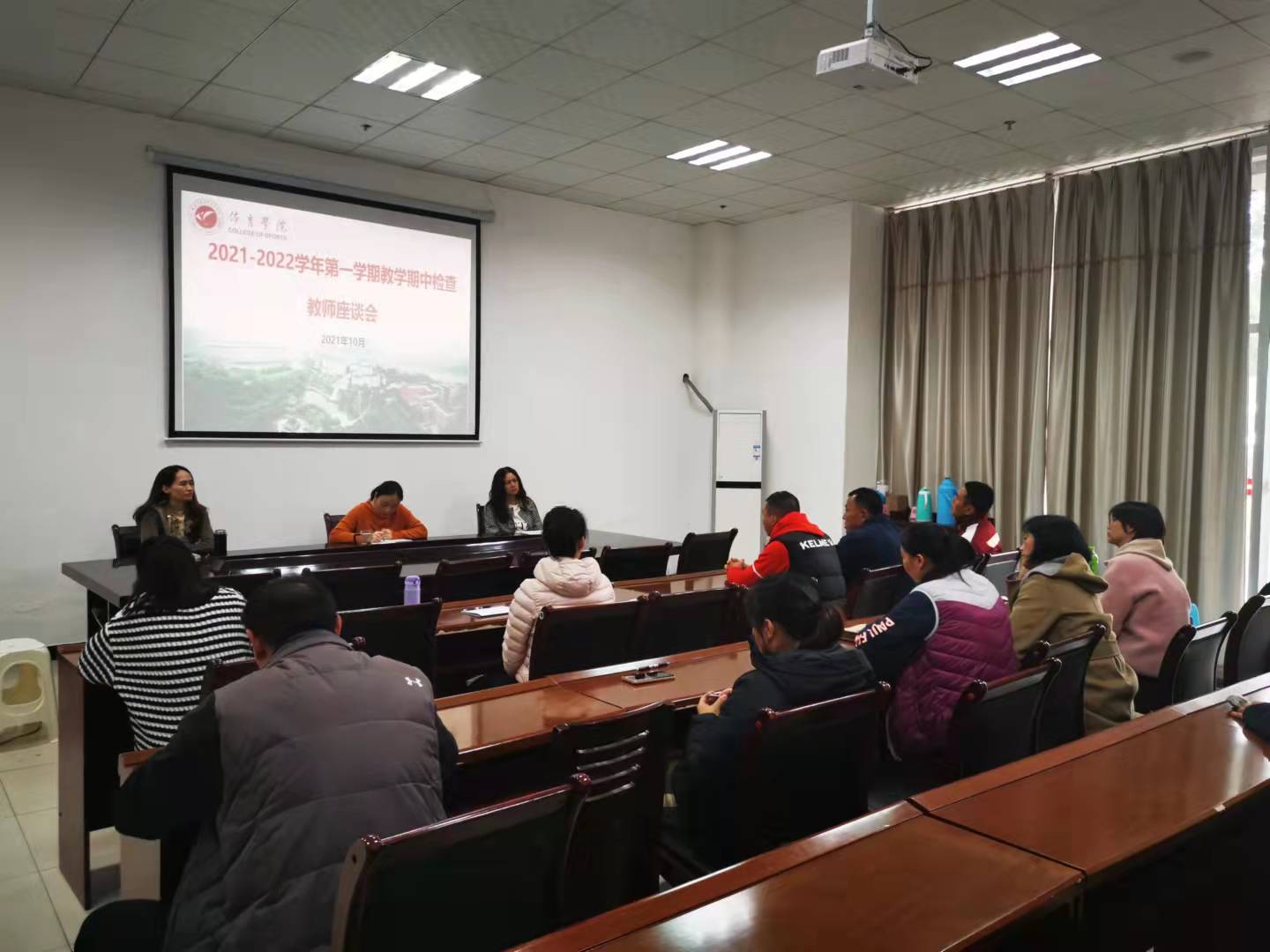 为全面了解和收集研究生、本科生教学中存在的问题,进一步提升教育教学质量和人才培养质量,10月28日,体育学院召开了教学中期检查教师座谈会,学院党总支书记邹小萍,党总支副书记何红媛、副院长王晓芳和教师代表参加会议,会议由学科建设办公室副主任闫雪锋主持。