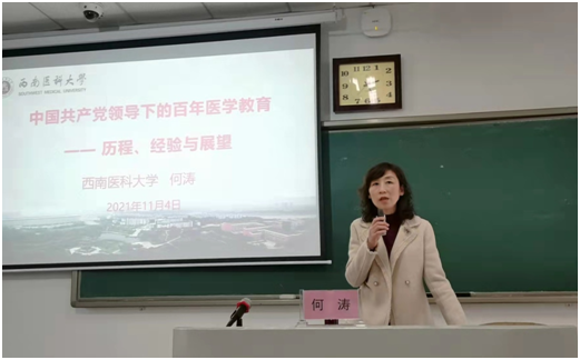 学校党委常务、副校长何涛作了《中国共产党领导下的百年医学教育:历程、经验与展望》专题讲座。对中国共产党领导下的医学教育历史脉络进行了全景式的梳理,总结历史经验、展开现实思考,并立足新发展阶段,展望未来医学教育新发展,对新教师提出开展教育教学改革的殷切期许。