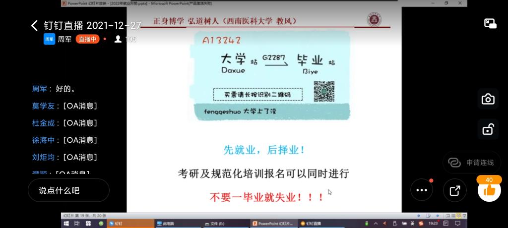 2021年,受新冠肺炎疫情影响,大学生就业面临诸多新情况新问题。麻醉学系党总支在抓好常态化疫情防控同时,积极发挥党建引领作用,扛起高校扎实做好“六稳”工作,完成“六保”任务中的政治责任,着力发挥党组织的战斗堡垒作用和党员的先锋模范作用,助力2022届毕业生就业创业工作。12月27日晚,麻醉学系党总支在钉钉平台召开“十二月就业空中课堂”。麻醉学系全体党政领导、党支部书记、兼职班主任、学生辅导员及2022届全体学生参加了此次会议,麻醉学系主任周军主持会议。