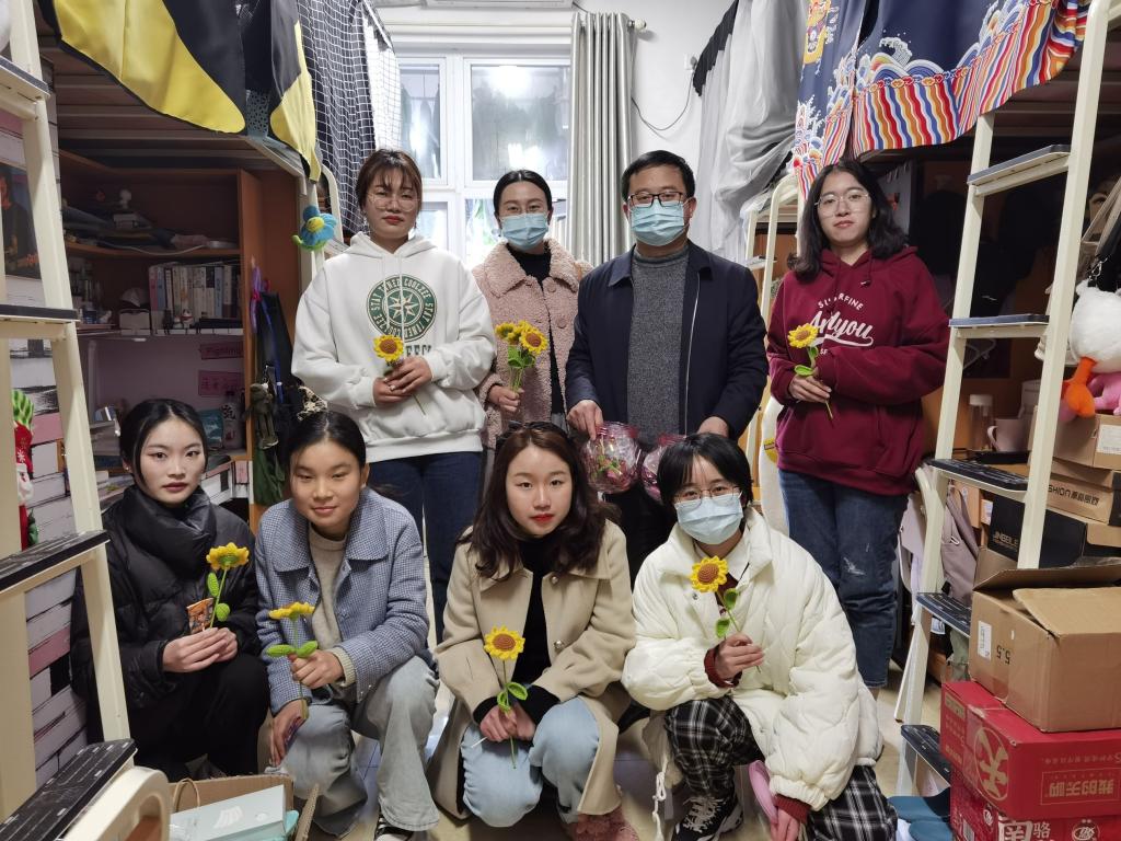 在学生宿舍,院系领导、老师们和同学们亲切交流,详细了解了学生在校衣食住行的情况和家庭近况。同时指导大家在疫情反弹的背景下,要做好自我防护,远离疾病。行程中,还为学生们送上代表乐观和向上的向日葵花朵,代表希望和鼓励的棒棒糖,祝福同学们,在新的一学期,调整好状态,尽快投入学习,用奋发昂扬的姿态,迎接2022年的春季学期。