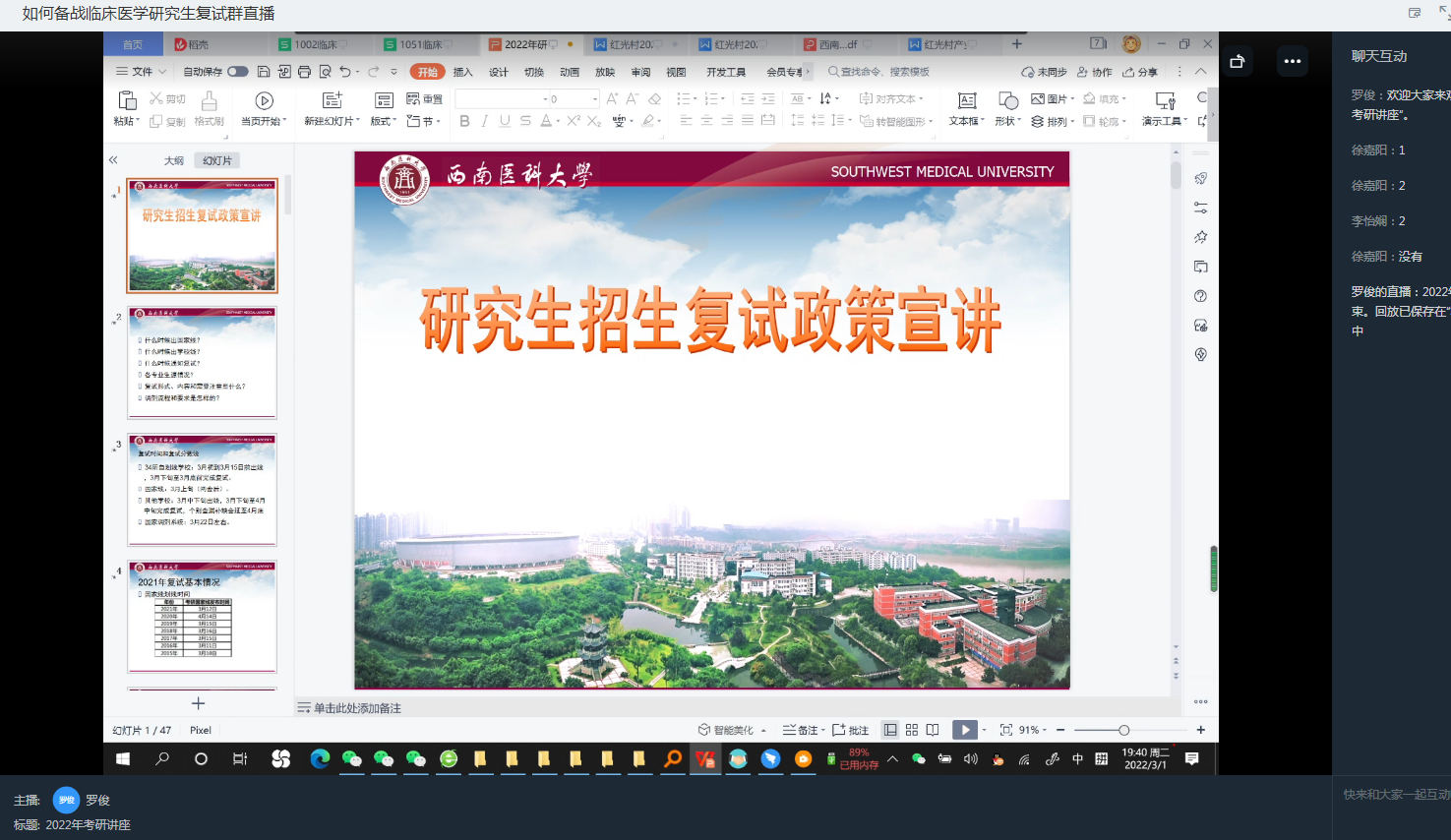 为更好地帮助学生了解研究生复试的相关注意事项,备战复试大关。3月2日晚,临床医学院特别邀请kaiyun官方网站入口招生办公室主任罗俊,通过钉钉开展“研究生招生政策宣讲”讲座,临床医学院2017级及2018级学生观看讲座。