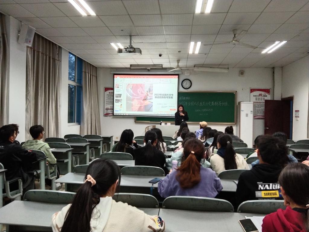 为了进一步提高医学检验专业大学生英语水平,全力备战2022年全国大学生英语竞赛,继续推进“检+”优秀学生培养计划“英语强化营”工作,3月22日晚,医学检验系在城北校区海川楼203教室举办2022年全国大学生英语竞赛辅导讲座。本次讲座邀请外国语学院刘羽涵老师主讲,学生科辅导员刘岩恕和全体参赛同学参加讲座。讲座由刘岩恕主持。