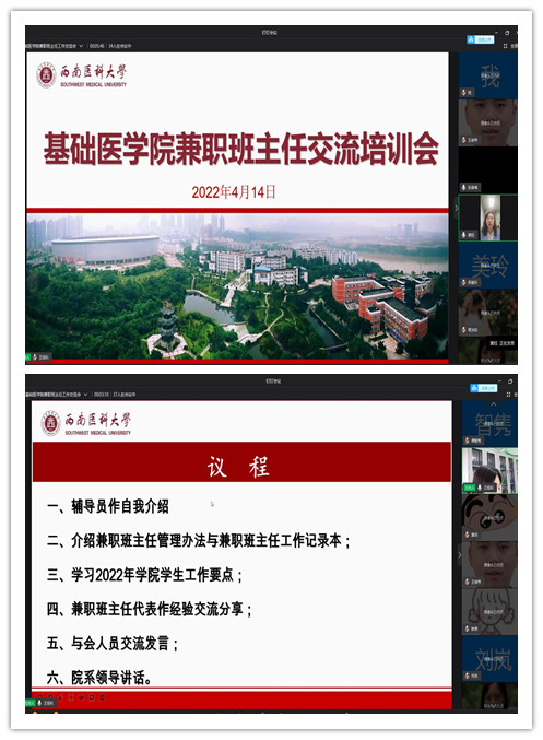 4月14日下午,基础医学院采取线上会议的方式组织召开兼职班主任交流培训会。学院党委副书记、纪委书记黄钰,副院长谭晓秋、兼职班主任、全体专兼职辅导员和辅导员助理共计50余人参加会议。会议由黄钰主持。
