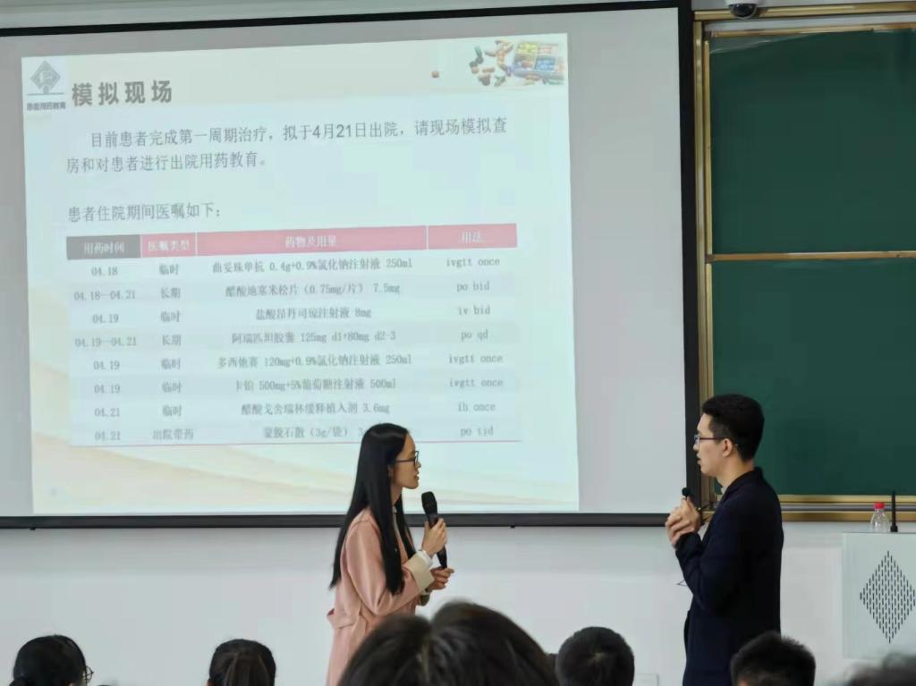 最后,魏齐铭通过角色模拟的方式,与学生现场互动,进行了一场即时模拟的患者问诊和出院用药教育,为学生“走进临床”作了很好的铺垫。
