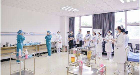 本次比赛基于临床病案操作,现场随机抽取题卡,设置两个赛道以模拟一例急诊患者核酸检查未出结果,转至病区缓冲病房救治为主线。根据案例进行实践技能操作,涉及临床常见异常心电图识别及对案例和操作项目进行分析判断处置能力。训练和考核护士穿脱防护服、心电监护、静脉输液等临床实践能力、应对能力、协作能力。
