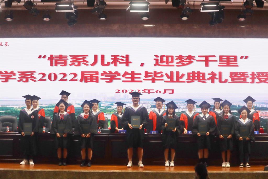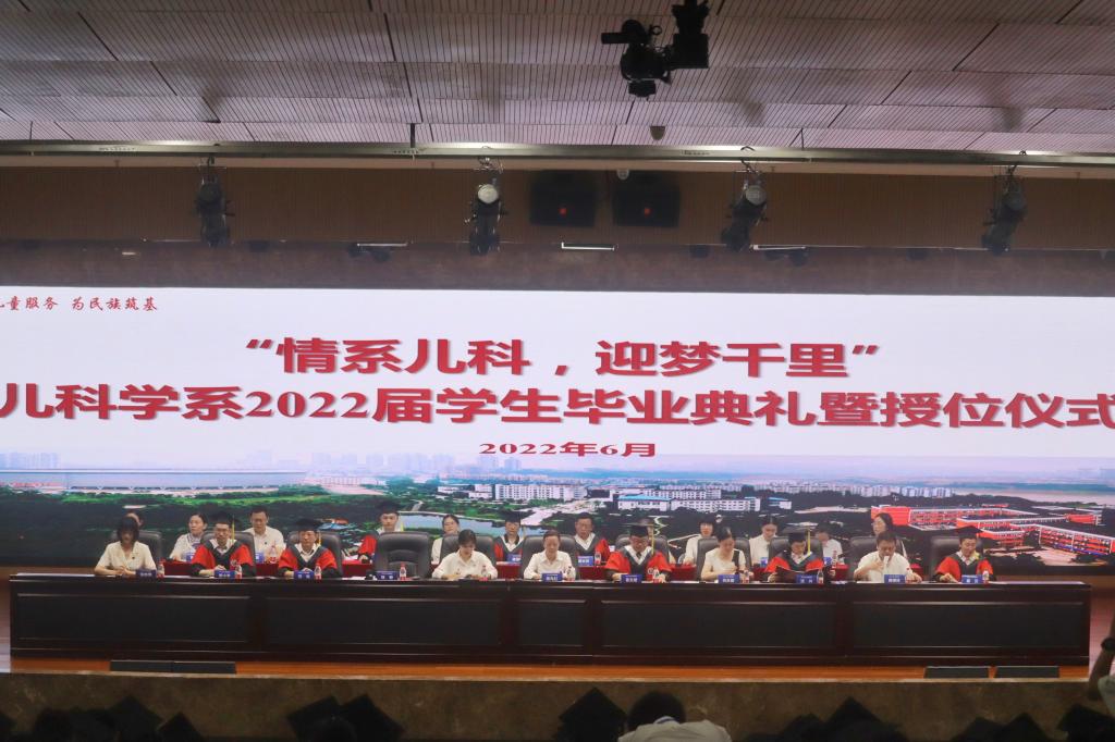 6月21日,儿科学系在城北校区第一学术报告厅举办了“情系儿科,迎梦千里”毕业典礼暨授位仪式。校学生工作部副部长易娟、儿科学系主任董文斌、儿科学系党总支书记杨敏、系党总支委员、历届党政班子成员、临床科室业务领导、教研室主任、教学秘书、教师代表、班导师代表、全体2022届儿科学硕士研究生和本科生、学生家长代表等出席典礼,典礼由杨敏主持。