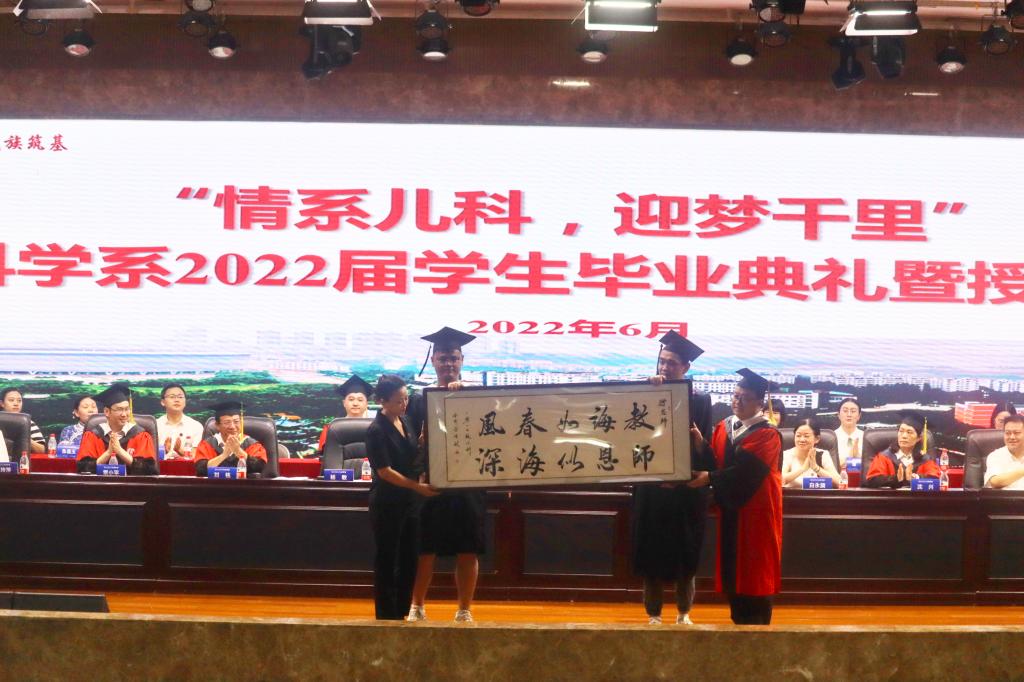 董文斌在典礼上致辞,他首先代表儿科学系向毕业生表示热烈祝贺,并向辛勤培育同学们的父母和老师致以衷心的敬意。他与毕业生共同回顾了大家在校期间取得的突出成绩、儿科学系近年来发生的巨大变化以及同学们与母校共同经历的重大事件。他深情寄语毕业生要牢记母校“厚德精业 仁爱济世”的校训,心怀梦想,在青春的赛道上不断奔跑,谱写属于自己的人生赞歌。教师代表雷小平告诫大家要学会摒弃“快餐式”的欢乐,启动深度思考,在数据信息爆炸的时代,批判性的吸收,始终守住那颗“独立之精神,自由之思想”的灵魂。研究生代表母丹和本科学生代表罗宇凌感谢了学校和老师的悉心培养,他们从稚嫩蜕变到沉稳,表示定当不负师恩,不负父母情,不负挚友爱,不负学校,不负时代,以守护儿童健康为终身奋斗事业!“教诲如春风,师恩深似海”,儿科学子饱含深情向院系献礼。这是一段珍贵的记忆,愿青年各有山海,各有盛大未来,愿儿科学子都能翻山而过,乘风破浪,初心不改。