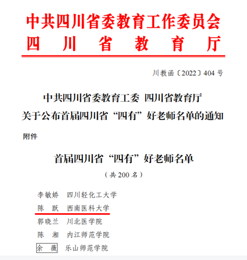 为大力宣传和热烈庆祝第38个教师节,充分展示新时代人民教师教书育人的动人风采和先进事迹,进一步营造全社会尊师重教的浓厚氛围,不断激励广大教师以实际行动迎接党的二十大胜利召开,近日,四川省教育厅公布了首届四川省“四有”好老师评选结果,全省200名教师获评首届四川省“四有”好老师,kaiyun官网医学影像系陈跃教授榜上有名。