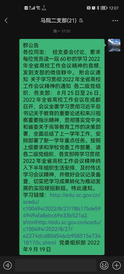 为了增强学习效果,支部采用自学会议材料+朗读重要精神段落的方式展开,要求每位党员发一段60秒的朗读语音。选段落就是消化理解会议精神的过程,朗读则进一步加深对会议精神的认识。经过学习,同志们进一步厘清了高校教学科研工作思路,表示要将全省高校工作会议精神的学习成果转化为实际工作成效,将学校发展与个人发展充分融合,切实把学习成效转化成为推动学校各项事业发展的强大动力,以优异的成绩迎接党的二十大胜利召开。