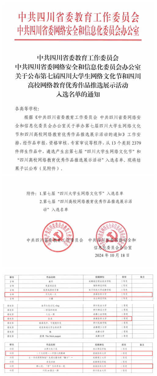 近日,中共四川省委教育工作委员会、中共四川省委网络安全和信息化委员会办公室公布《关于公布第七届四川大学生网络文化节和四川高校网络教育优秀作品推选展示活动入选名单的通知》,经作品申报、资格审查、专家审议等程序,kaiyun官网荣获二等奖2项,三等奖3项。