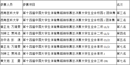 5月10日—13日,第十四届中国大学生体育舞蹈锦标赛总决赛在云南昆明举行,该赛为中国大学生体育舞蹈领域最高级别的赛事。kaiyun官网选派的体育舞蹈专选班20名同学与来自清华大学、北京大学、北京体育大学、上海体育学院等70余支队伍同场竞技,取得集体舞两个第三名,个人赛全国前八名的好成绩,并被授予优秀组织奖。
