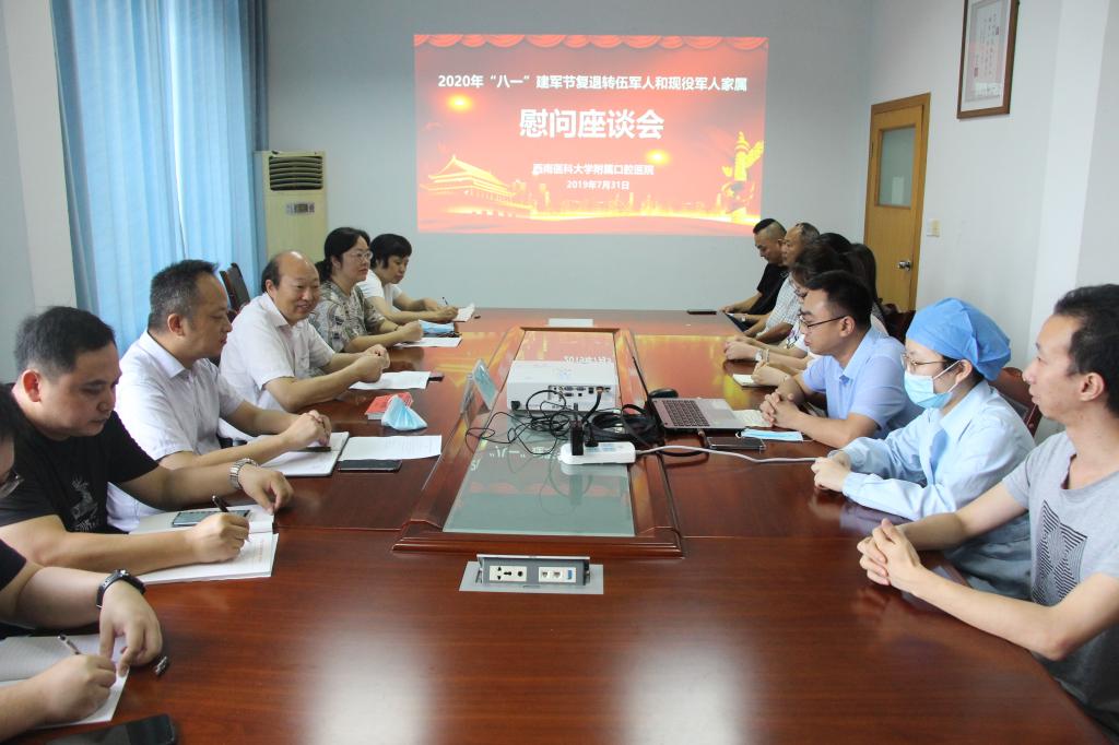 在中国人民解放军建军93周年之际,7月31日,附属口腔医院组织召开复转退伍军人和现役军人家属建军节座谈会,会议由附属口腔医院党委书记李正新主持。附属口腔医院副院长郭玲、屈进、相关职能部门负责人和医院复转退伍军人及现役军人家属参加座谈会。