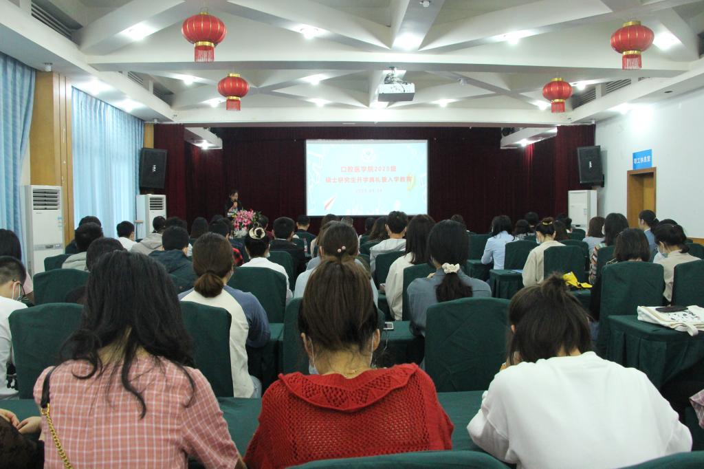 9月24日上午,口腔医学院在附楼多功能厅隆重举行2020级硕士研究生开学典礼,口腔医学院党委书记代天祥、院长肖金刚、党委副书记王宏丽、副院长郭玲、副院长屈进、研究生科教师、各教研室主任、科室主任、部分研究生导师、2019级研究生会干部、2020级全体研究生参加本次开学典礼,典礼由王宏丽主持。