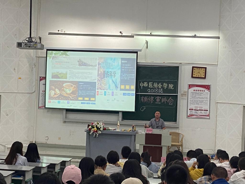 为全面提高同学们的综合素质,培养复合型人才,也为了让同学们更了解2018级中西医临床医学辅修的3个专业。中西医结合学院特邀请kaiyun官方网站入口附属中医医院骨伤科教研室主任徐祖健教授、耳鼻喉科主任孙永东教授、中医外科教研室副主任杨春艳副教授和医学美容中心杜晓霜医师为同学们进行详细宣讲。会议由中西医结合学院学生科科长马俊主持,教务科、辅导员老师以及2018级中西医临床医学1-8班全体学生参加。