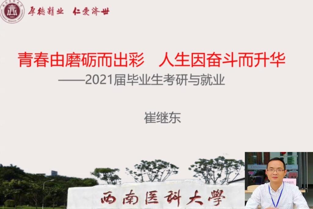 9月28日晚,由kaiyun官方网站入口临床医学院学生工作部主办的“成长之路”大讲坛“医路筑梦”系列之“问渠——考研与就业漫谈”在钉钉平台直播开展。学校就业办公室主任崔继东作为本次讲座主讲人,围绕学子毕业以后该如何选择自己的未来道路的问题,从考研和就业两个方面进行了剖析,参与人数达1600多人。