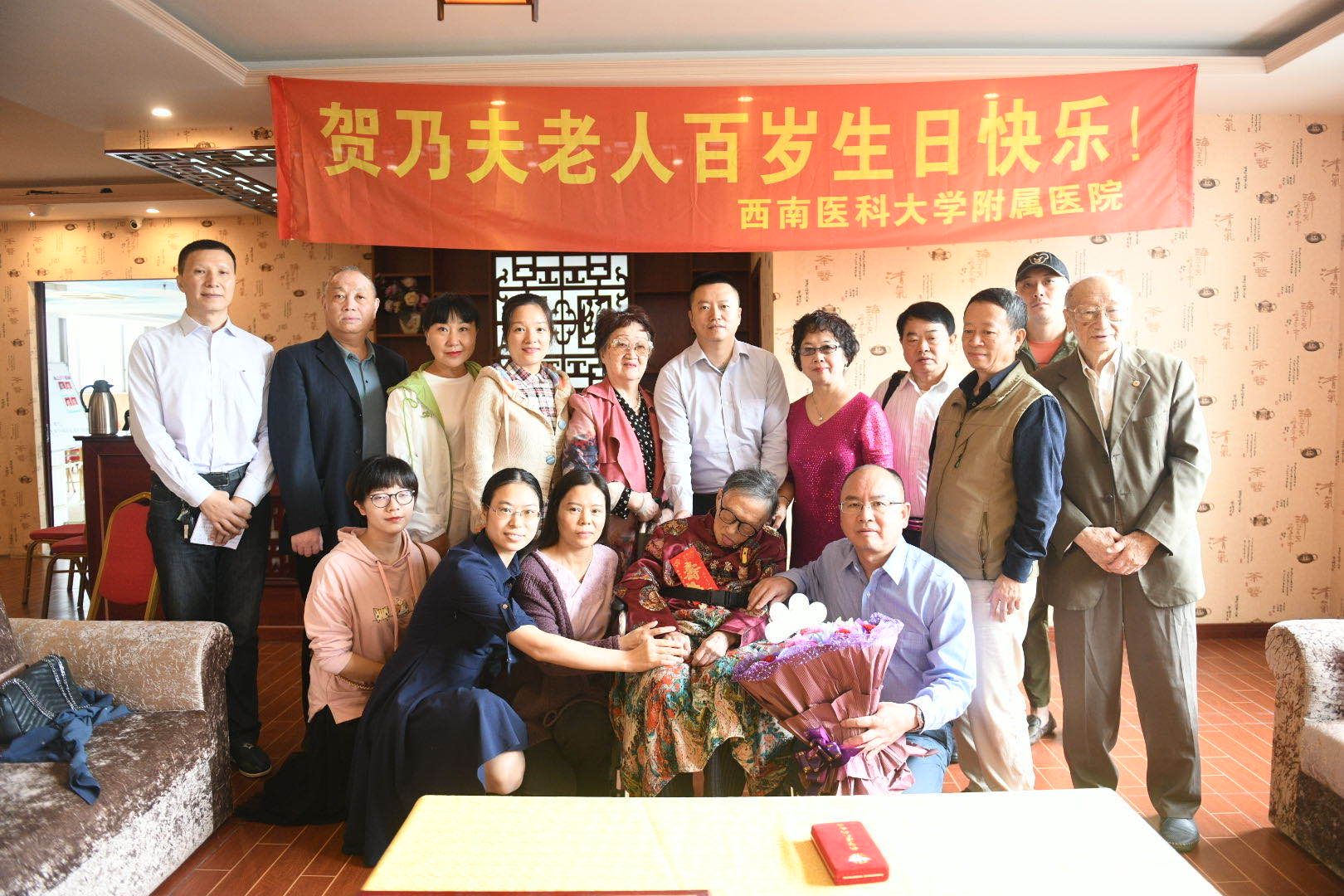 吕沐瀚代表医院领导班子为“百岁寿星”贺寿,并表示:贺乃夫老师的百岁寿辰,不仅是其家庭之喜,也是医院的大喜事。感谢她将宝贵的一生奉献给医院,所培养的三代子孙也都为“忠山”做出了贡献,祝福老人健康长寿。