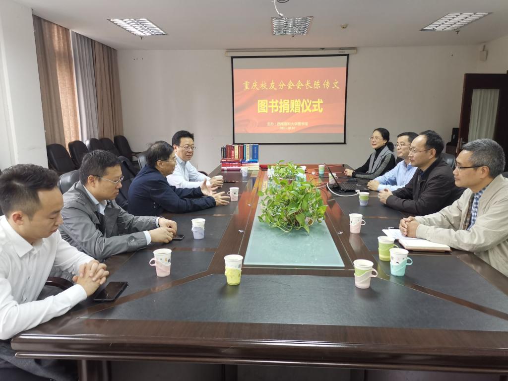 10月10日下午,重庆校友分会会长陈传文向学校图书馆捐赠自己收藏的文献类图书300册。捐赠仪式在逸夫图书馆二楼会议室举行。对外联络处处长杨勰、图书馆馆长王钦、副馆长冯勤、随行校友及图书馆部分职工参加了捐赠仪式。