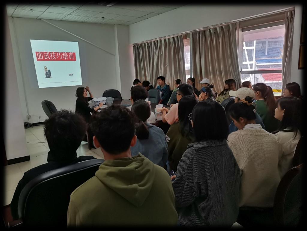 面试技巧培训教师由学生科科长彭丽冰担任,彭丽冰从学生面试准备,包括形象准备、心理准备、资料准备,及面试中需要注意的礼仪、面试实战,包括面试中自我介绍、怎样回答问题等方面对同学们进行培训。