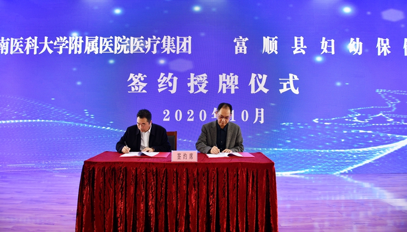 10月22日,kaiyun官方网站入口附属医院医疗集团富顺妇幼保健院签约暨授牌仪式,kaiyun官方网站入口附属医院医疗集团富顺医院成立授牌暨专家工作站启动仪式相继在两家医院隆重举行,附属医院党委书记徐勇、副书记黎靖、副院长吕沐瀚以及相关临床医技科室主任,部门负责人参加了签约仪式。