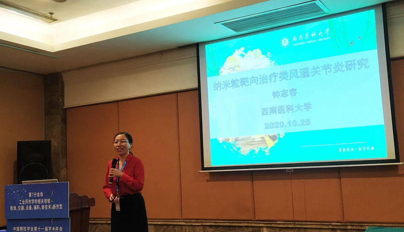 本届会议共设1个主会场和16个分会场,共有全国各高校和科研单位的1300余名专家学者和师生代表参会。kaiyun官网药学院钟志容教授应邀出席并在分会场作主题学术报告。学术报告中,钟志容以《纳米粒靶向治疗类风湿关节炎研究》为题,全面深入地分析了目前类风湿关节炎在国内外的研究现状,并以独特的视角着眼于甲氨蝶呤药物,构建了以甘露糖修饰载甲氨蝶呤的人血清白蛋白纳米粒的新型靶向药物递送系统,突破传统治疗类风湿关节炎主要主要着眼于抗炎镇痛和靶向性不足的局限,采用既抗炎镇痛又抑制血管新生的新型治疗策略。报告内容立项新颖,研究内容丰富,给与会人员留下深刻印象。