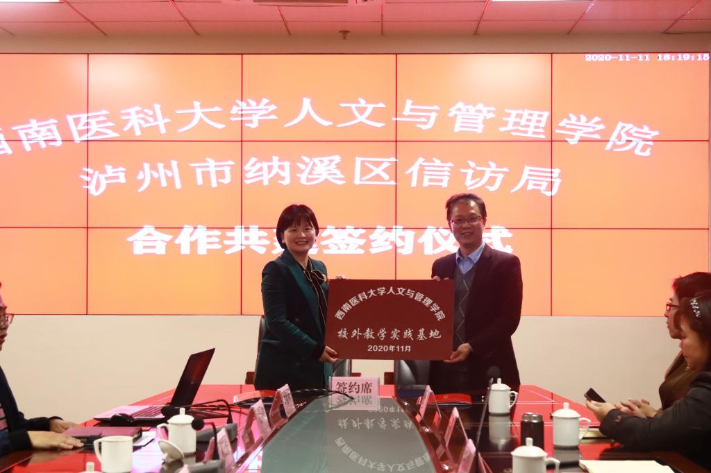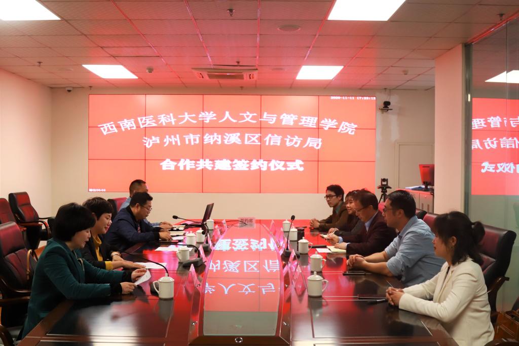 近日,kaiyun官网人文与管理学院和泸州市纳溪区信访局进行合作共建签约暨实践教学基地挂牌仪式。泸州市纳溪区人民政府副区长周云波、泸州市信访局机关党委书记罗洁、纳溪区信访局党委书记马洪超、局长彭仲芳、kaiyun官方网站入口人文与管理学院院长赵成文、党总支书记陈屹、党总支副书记马俊、党政办副主任刘欣、心理学教研室副主任汪枭参加了此次会议。