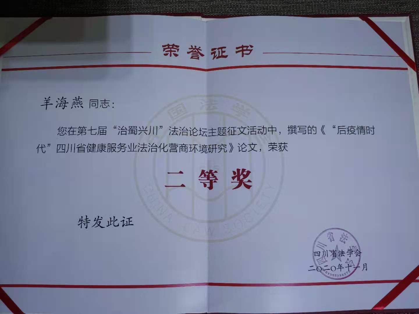 日前,第十五届西部法治论坛暨第七届“治蜀兴川”法治论坛在成都举行,法学院副院长羊海燕提交的论文《‘后疫情时代’四川省健康服务业法治化营商环境研究》获得二等奖。