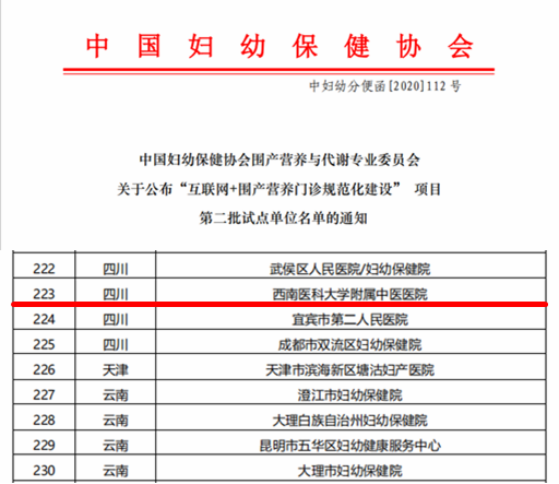近日,中国妇幼保健协会围产营养与代谢专业委员会发布了《关于公布‘互联网+围产营养门诊规范化建设’项目第二批试点单位名单的通知》,附属中医医院获批项目第二批试点单位。