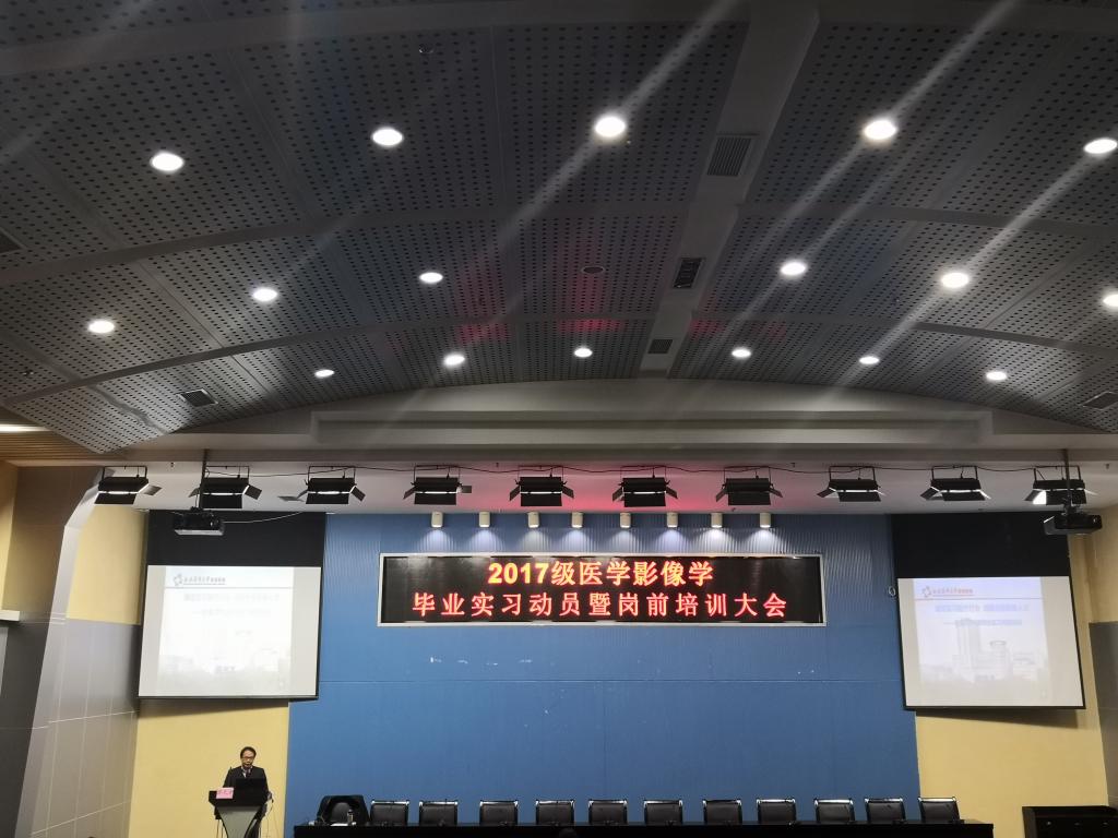 日前,为帮助学生了解实习分配相关事宜,做好实习准备工作,医学影像系在忠山学术报告厅组织召开2017级医学影像学毕业实习动员暨岗前培训。本次培训由影像诊断教研室主任唐光才主讲,医学影像系学生科副科长苏娜主持,2017级医学影像学专业全体学生参加。