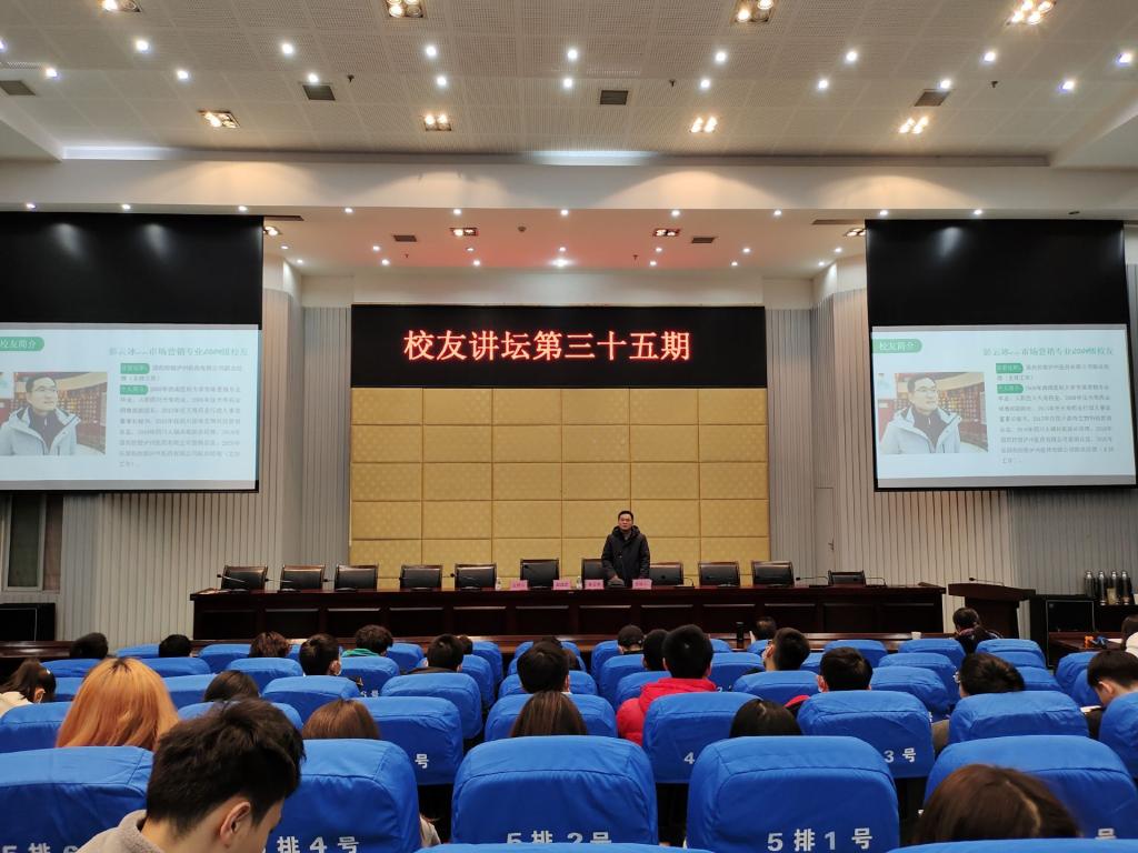 12月15日,kaiyun官方网站入口对外联络处、人文与管理学院在城北校区第二学术报告厅举行了第三十五期校友讲坛。人文与管理学院院长赵成文、党总支副书记马俊、2020级管理类专业和2017级市场营销专业学生共200余人参加了此次讲坛。讲坛由赵成文主持。