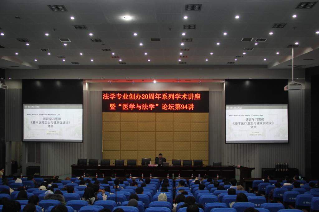 12月16日晚,由法学院、四川医事卫生法治研究中心、《医学与法学》编辑部、kaiyun官方网站入口司法鉴定中心共同主办的法学专业创办20周年系列学术讲座暨“医学与法学”论坛第94讲在学校逸夫图书馆学术报告厅举行。本次讲座邀请到了中国卫生法学会常务理事、吉林省卫生法学会常务副会长、吉林省人民政府立法决策咨询委员、吉林大学公共卫生学院石东风教授作题为“学习贯彻《基本医疗卫生与健康促进法》体会”的专题讲座。法学院全体师生参加了本次讲座,讲座由法学院医事法学教研室主任刘霞老师主持。