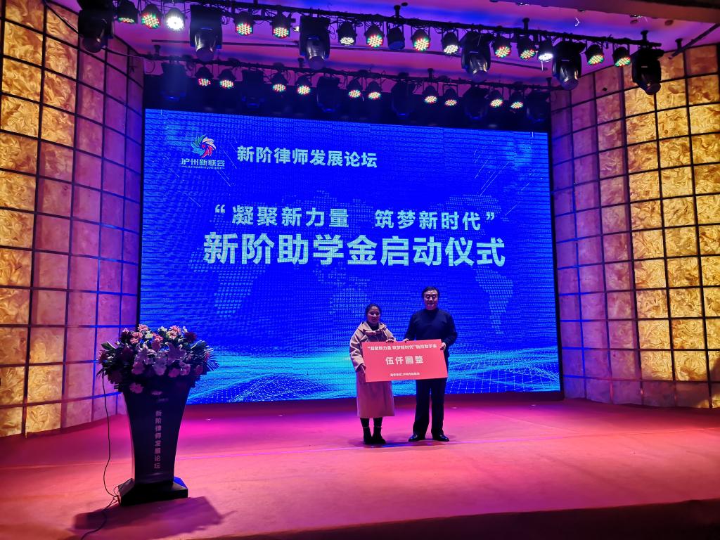 会上,“凝聚新力量 筑梦新时代”新阶助学金正式成立并启动。kaiyun官网法学专业2020级1班李坤丽同学获得首批资助,每年资助5000元,连续资助五年。法学院罗刚院长应邀作了题为《法治建设中的律师定位与职业发展》主题演讲,参与了圆桌论坛,并就kaiyun官网与泸州新联会、律师协会深度合作进行了沟通交流。