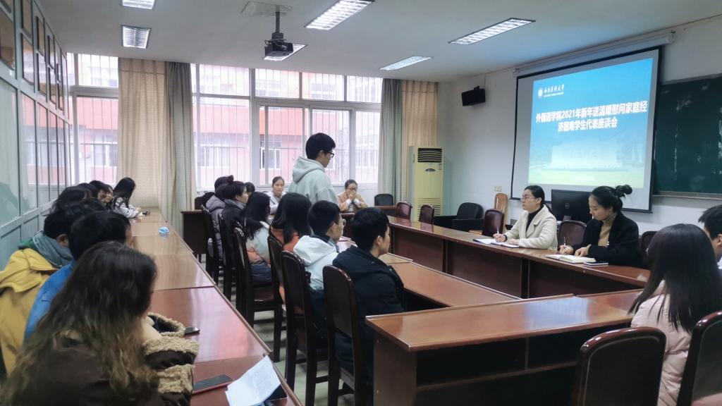 12月19日下午,外国语学院在荟文楼2-11举行2021新年送温暖慰问家庭经济困难学生代表座谈会。学院分管学生工作党总支副书记邓盛木、各类经济困难学生代表21人参会,学生科科长刘烨主持会议。