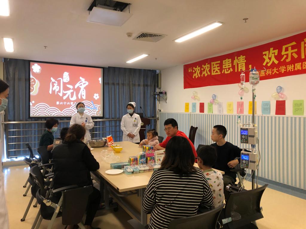 晚饭之际,杨春、魏丽平和儿外科医护人员一起将小朋友们自己包的汤圆分发到小朋友手中,由小朋友亲手将汤圆送给自己的家长,整个病房洋溢着浓浓的爱意。小朋友们通过听老师介绍元宵节的意义、民族习俗及元宵节的来历及亲手制作汤圆、猜灯谜的体验,和家长一起分享劳动成果,庆祝节日,使其更加热爱我们古老厚重的中国文化,尽情品味着浓浓的中国风,并在浓郁的节日氛围中接受爱国主义的熏陶。