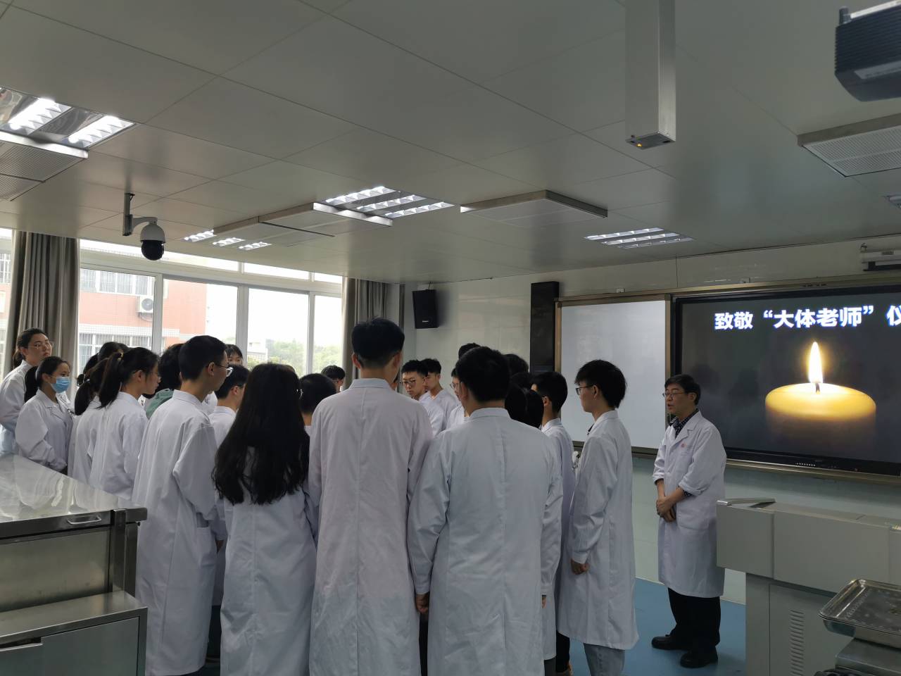 2021年新学期伊始,基础医学院人体解剖学教研室全体教师在教研室主任余崇林的带领下,先后开展以“致敬大体老师”为主题的解剖学实验课堂课程思政教育活动。在庄重肃穆的气氛中,学生们佩戴白花,在老师带领下向“大体老师”鞠躬致敬、默哀悼念,并重温了医学生誓言。