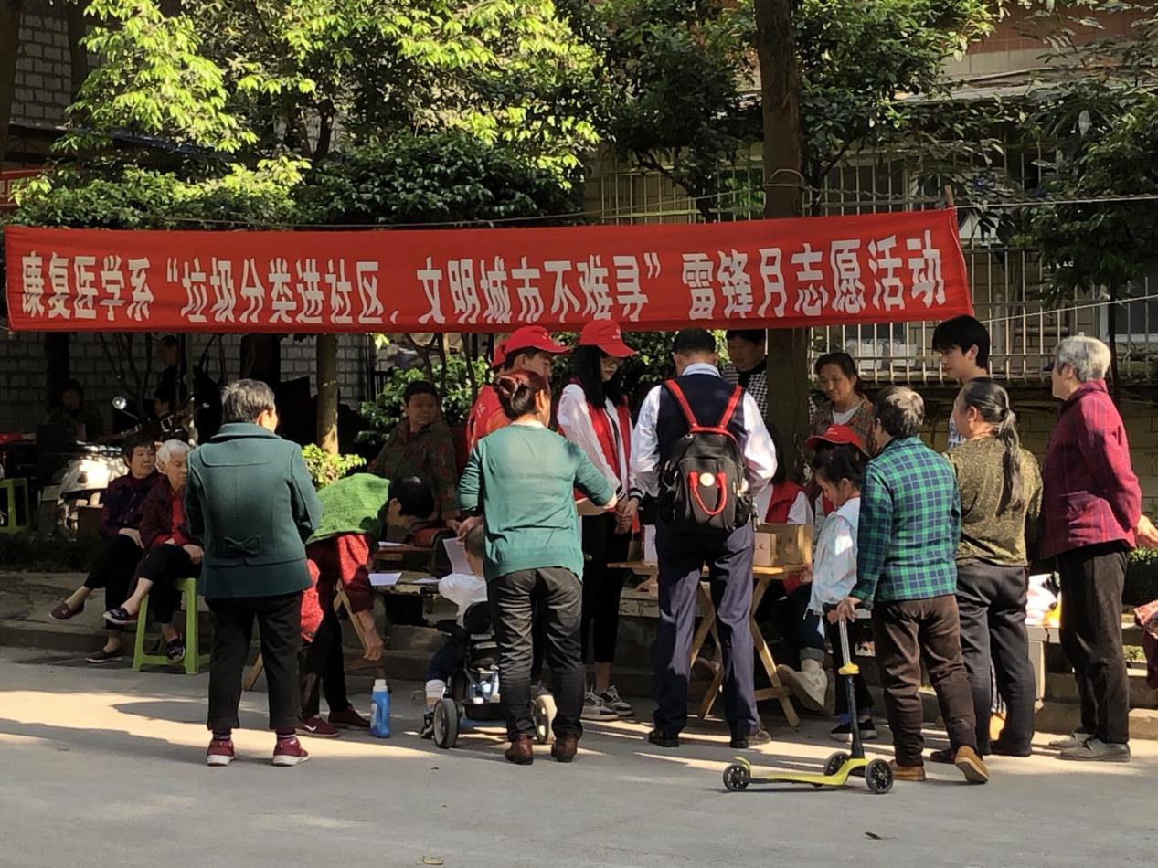 为积极响应国家号召,做好城市垃圾分类,营造文明、温馨的城市环境,3月28日,康复医学系“携手聚益志愿者团队”在泸州市龙马潭区金山苑社区开展“垃圾分类进社区,文明城市不难寻”雷锋月志愿活动。