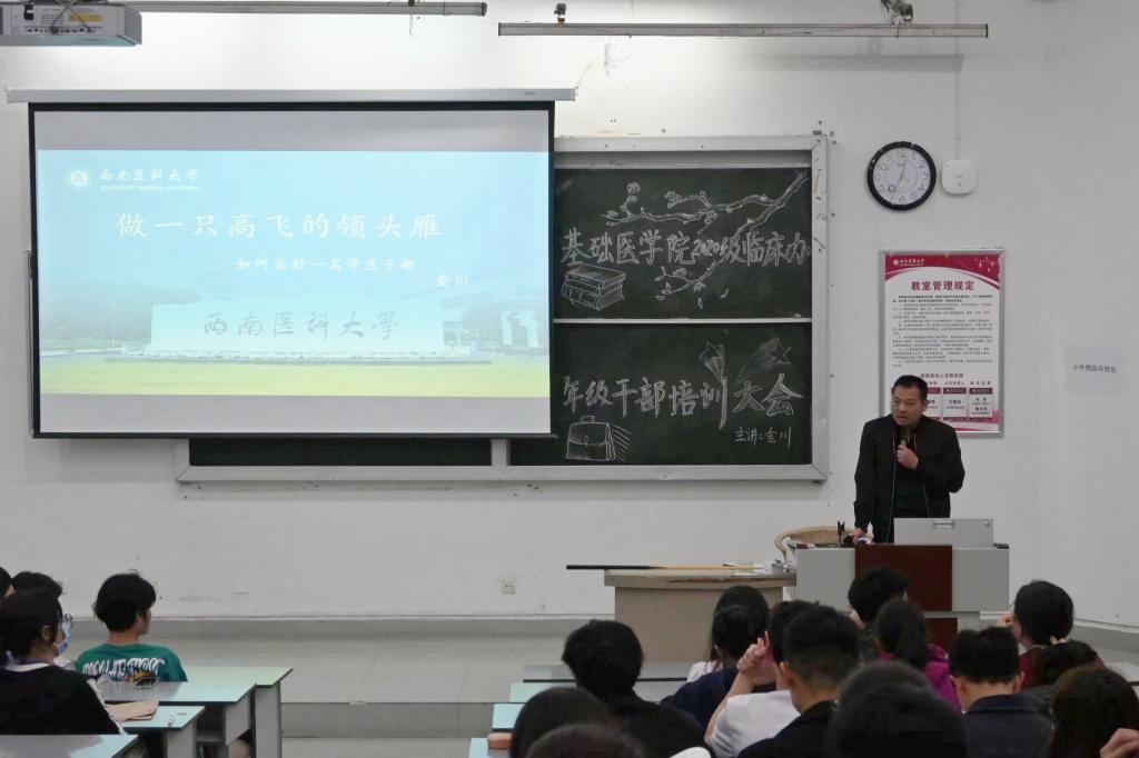 为切实加强学生干部队伍建设,提高履职能力,4月12日晚,基础医学院2020级临床办在明理楼101教室举办“做一只领头高飞的雁”学生干部培训大会。本次培训由2017级二办年级主任金川主讲,2020级临床办年级副主任阳永连、辅导员唐义杰、杨忆雪以及年级学生干部100余人参加本次培训。