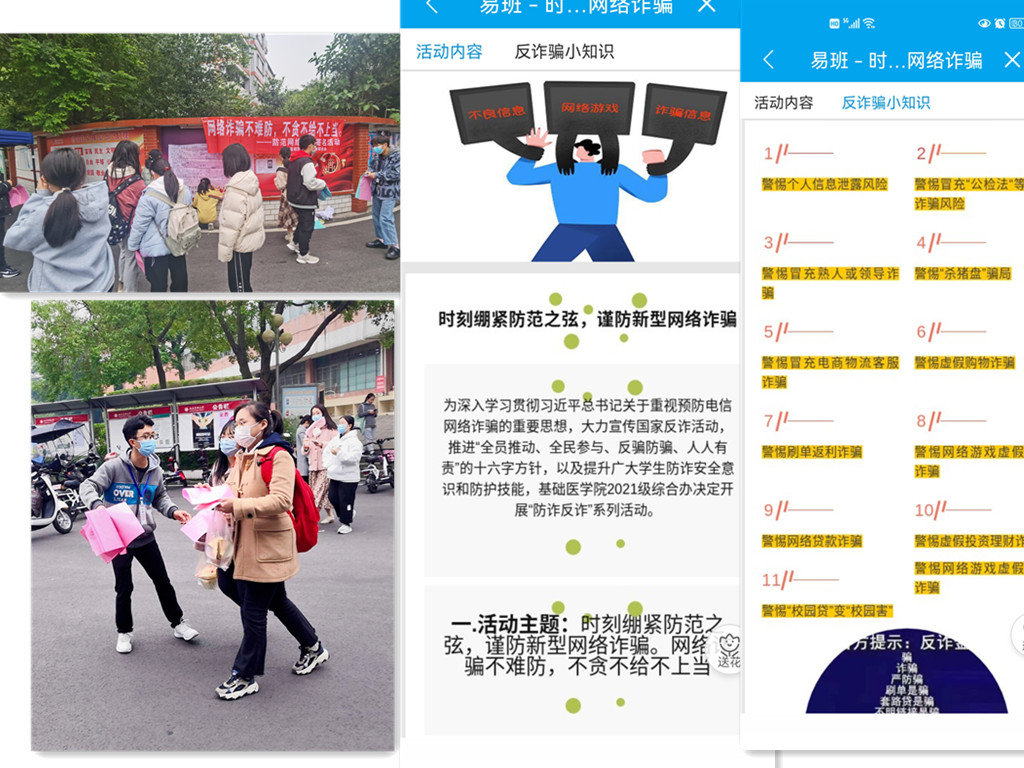 当前,校园网络诈骗案件日益增加,越来越多的大学生成为网络诈骗分子眼中的“肥羊”。为提高kaiyun官网学生的网络诈骗防范意识,避免学生利益受到不法分子的侵害,11月11-13日,基础医学院2021级综合办在稻香苑和桂香苑门口开展了主题为“网络诈骗不难防,不贪不给不上当”的防范网络诈骗签名宣传活动,同时在易班上开展了“时刻紧绷防范之弦,谨防新型网络诈骗”的知识竞答活动。